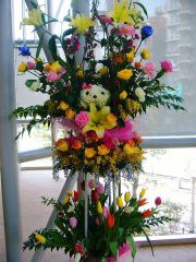 カーネーションでワンちゃんを作りました。発表会や展示会 お店の開店に飾ってみたら必ず通る人が立ち止まるよ。 スタイル:スタンド花 奥行:約60cm×幅:約100cm×高さ:約180cm 花材:バラ、ユリ、カーネーション 他 資材・ラッピング:スタンド