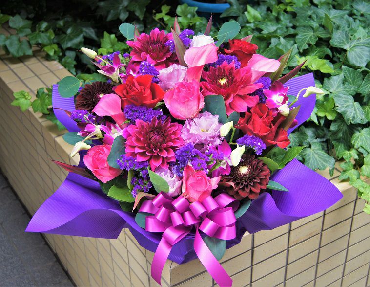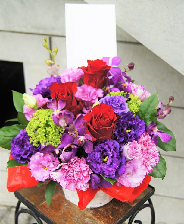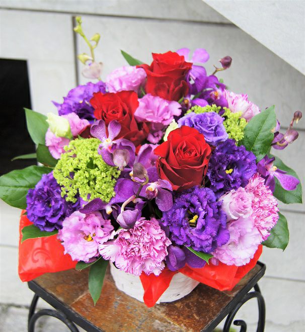 パープルと赤バラの艶めきアレンジ
