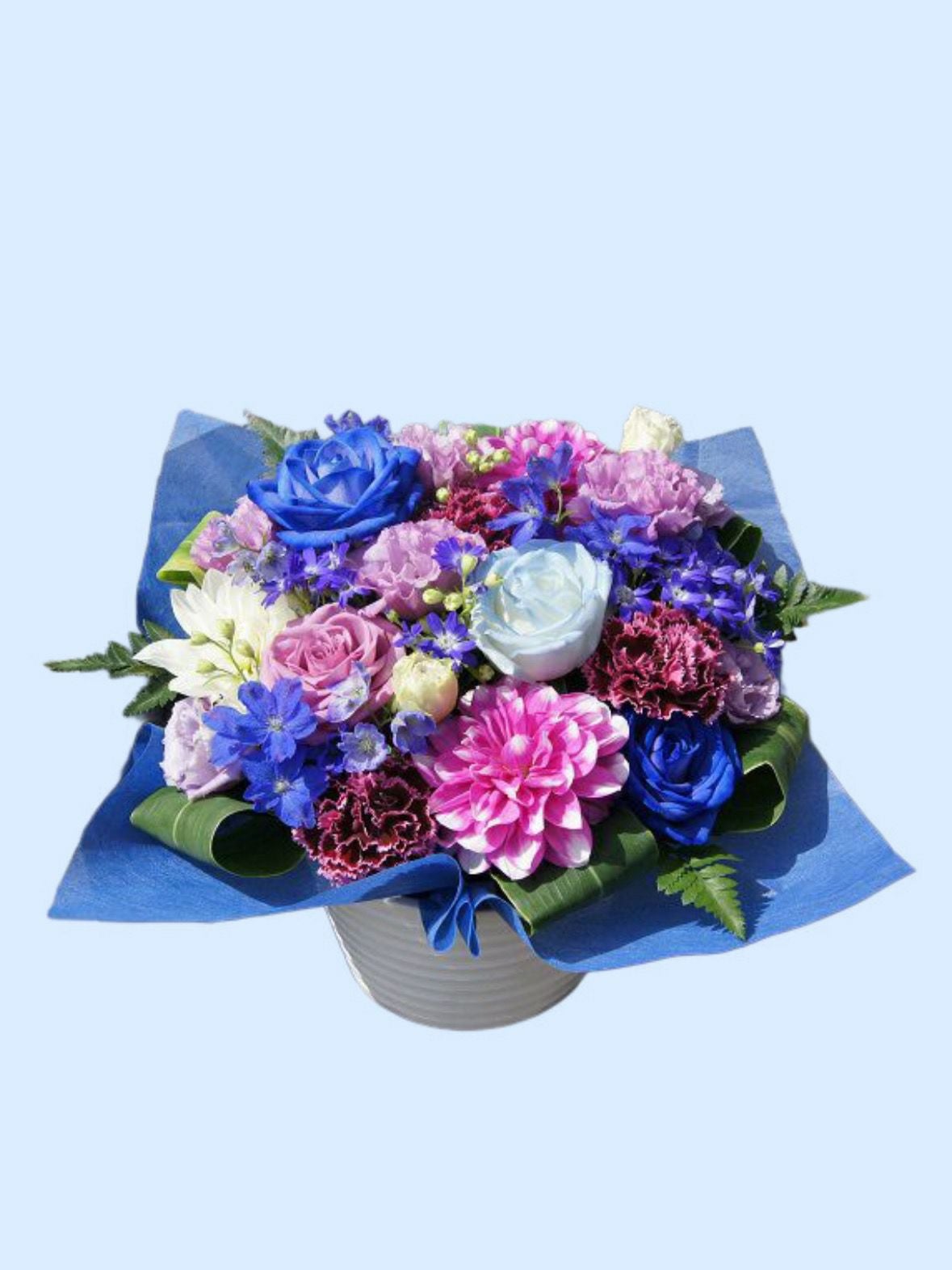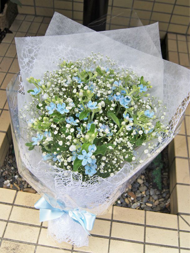 ブルースターとカスミソウの清楚な花束