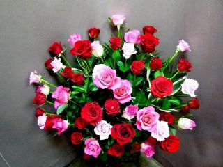 赤バラとピンクバラ合わせて50本を天女が舞うように丸く散らばせて作りました。感声を上げること間違いなし。 スタイル:アレンジメント 花材:メイン バラ その他 葉 資材・ラッピング:和紙 おしゃれなカゴ