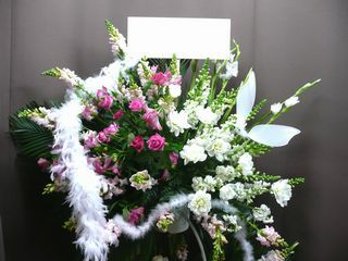 スタイル:スタンド花 奥行:約60cm×幅:約150cm×高さ:約180cm 花材:バラ、キンギョ、アルストロメリア他 その他:やわらかいフェザ 資材・ラッピング:おしゃれスタンド