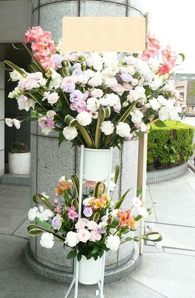 スタイル:スタンド花 奥行:約70cm×幅:約150cm×高さ:約180cm 花材:カーネーション、キンギョ、トルコキキョ 資材・ラッピング:おしゃれスタンド