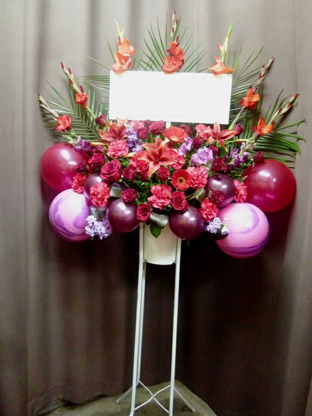 赤、ピンク、紫のマーブル模様のバルーンに真紅のバルーンを合わせ、花材は赤をメインでアレンジしました。シックな中にセンスが光ります。 奥行:約60cm×幅:約110cm×高さ:約180cm 花材:バラ ユリ グラジオラス 他 その他 葉 資材・ラッピング:スタンド ※御用途に応じてバルーンを変更できます。