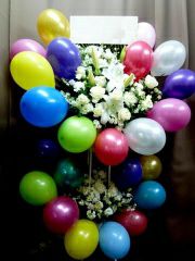 色々なカラーのバルーンを お花の周りにアレンジしました。お花は白のばらを中心に白のお花で作りました。ドロップみたいだね。 ※地域によりましてはお届け出来ない場合がございます。お問い合わせ下さい。 スタイル:スタンド花 奥行:約 60cm× 幅:約 130cm× 高さ:約 180cm