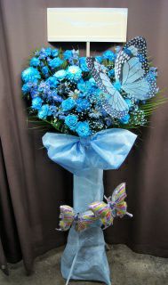 スカイブルーの大きなハートに大きな蝶々*スタンド花