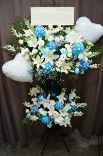 かわいい水色とさわやかな白のスタンド花2段