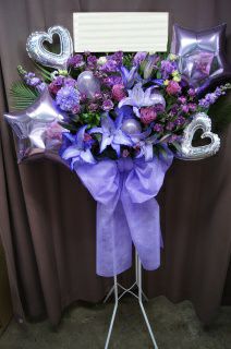 紫色のお花でまとめました。ハートと星のバルーンがきらり☆まるで宝石箱を開いたかのようなスタンド花です。大きなリボンも印象的です。 奥行:約60cm幅:約110cm×高さ:約180cm 花材:バラ、ユリ 他 資材・ラッピング:バルーン、リボン、スタンド ☆季節や仕入れ状況によりお花の種類が異なる場合がございます。