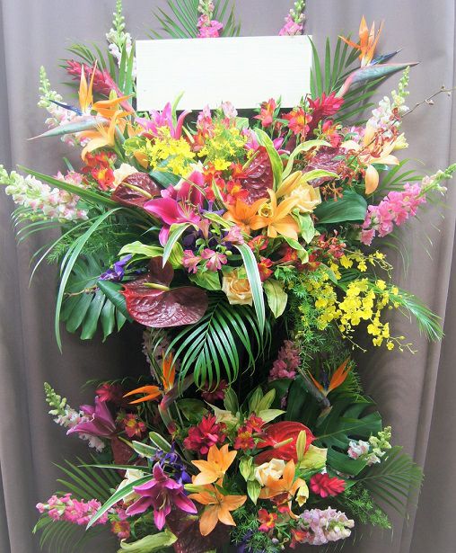 色々なお花をふんだんにあしらったカラフルでゴージャスなスタンド花です。伸びやかなグリーンが印象的です。 奥行:約60cm幅:約110cm×高さ:約180cm ※花材は季節によって変わる事があります。
