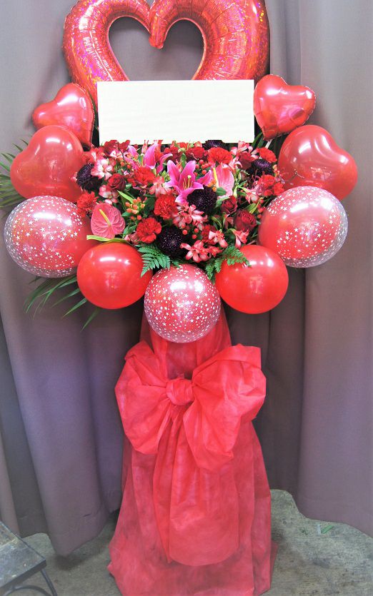 大きなハートが印象的なバルーンのスタンド花です。真ん中には赤系のお花がふんだんに使われています。脚の部分のリボンの装飾でゴージャス感もUP☆ ☆色の変更などお気軽にご相談ください(^^♪ ☆季節や仕入れ状況によりお花が異なる場合がございます。