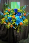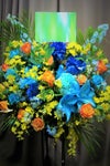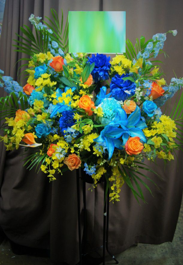 冴える黄色×水色のビビットな色合いが綺麗なゴージャススタンド花です! ※特殊な染色をしているため、急なご注文には対応できない場合がございます。